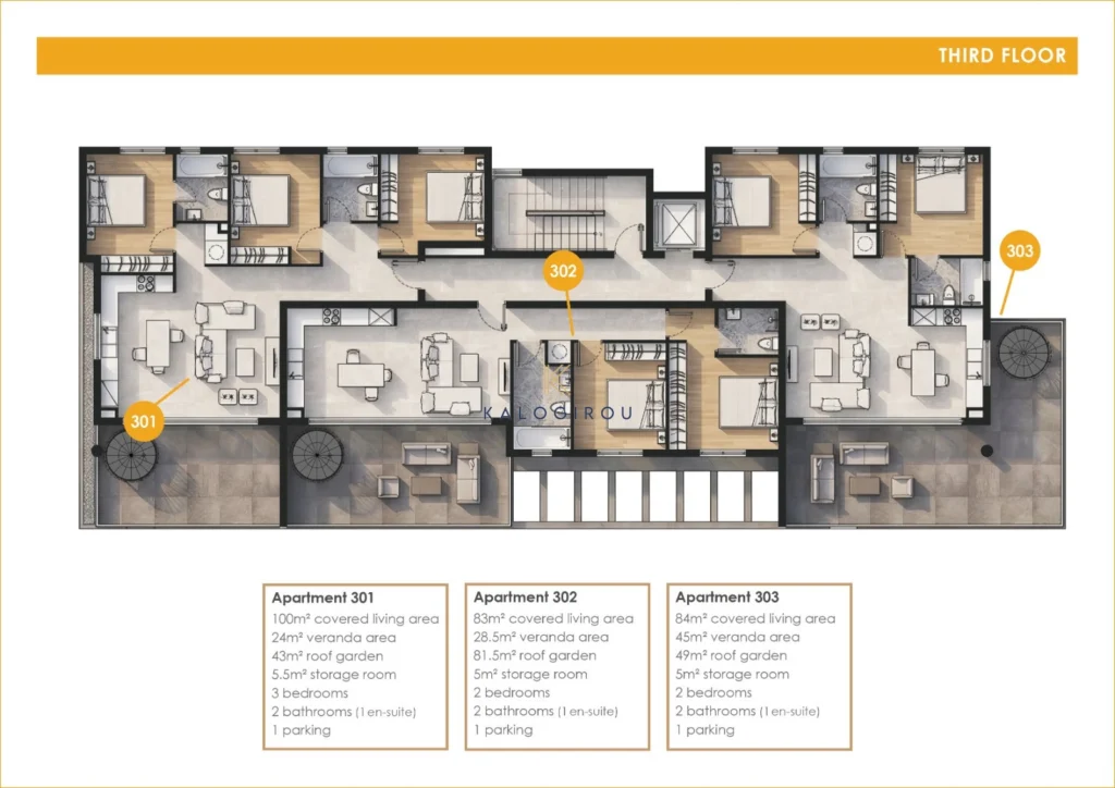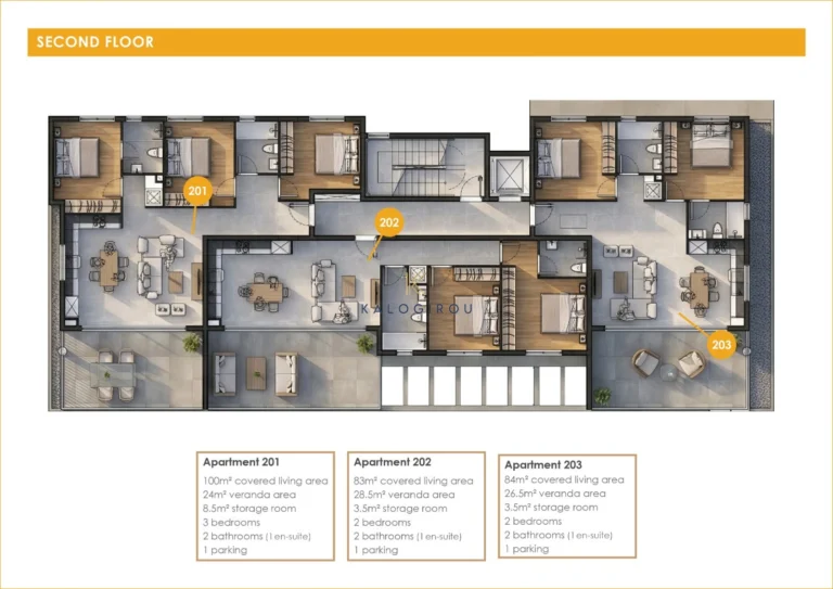 Second floor apartment for sale in Oroklini, Larnaca. It consists of an open plan kitchen-living-dining area, three bedrooms-master bedroom en suite with shower, main shower room and covered veranda. In addition, the apartment has allocated uncovered parking and storage on the ground level.