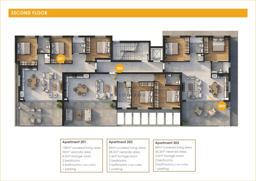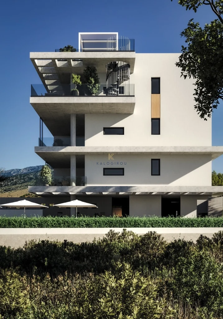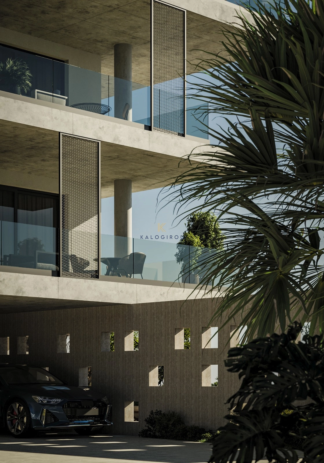 Second floor apartment for sale in Oroklini, Larnaca. It consists of an open plan kitchen-living-dining area, two bedrooms-master bedroom en suite with shower, main shower room and covered veranda. In addition, the apartment has assigned one uncovered parking and storage on the ground level.