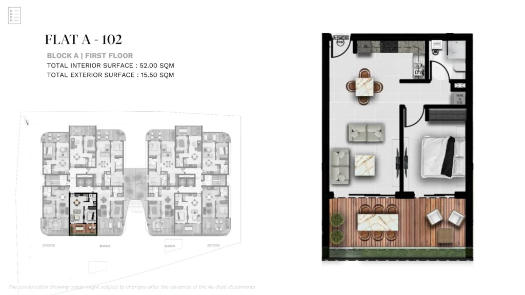 A modern 1-bedroom apartment located within a secure gated residential development in the peaceful outskirts of Larnaca, in the area of Aradippou. Just minutes from the city center, the project is designed to combine contemporary comfort with relaxed Mediterranean living.
