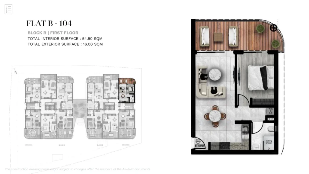 A modern 1-bedroom apartment located within a secure gated residential development in the peaceful outskirts of Larnaca, in the area of Aradippou. Just minutes from the city center, the project is designed to combine contemporary comfort with relaxed Mediterranean living.