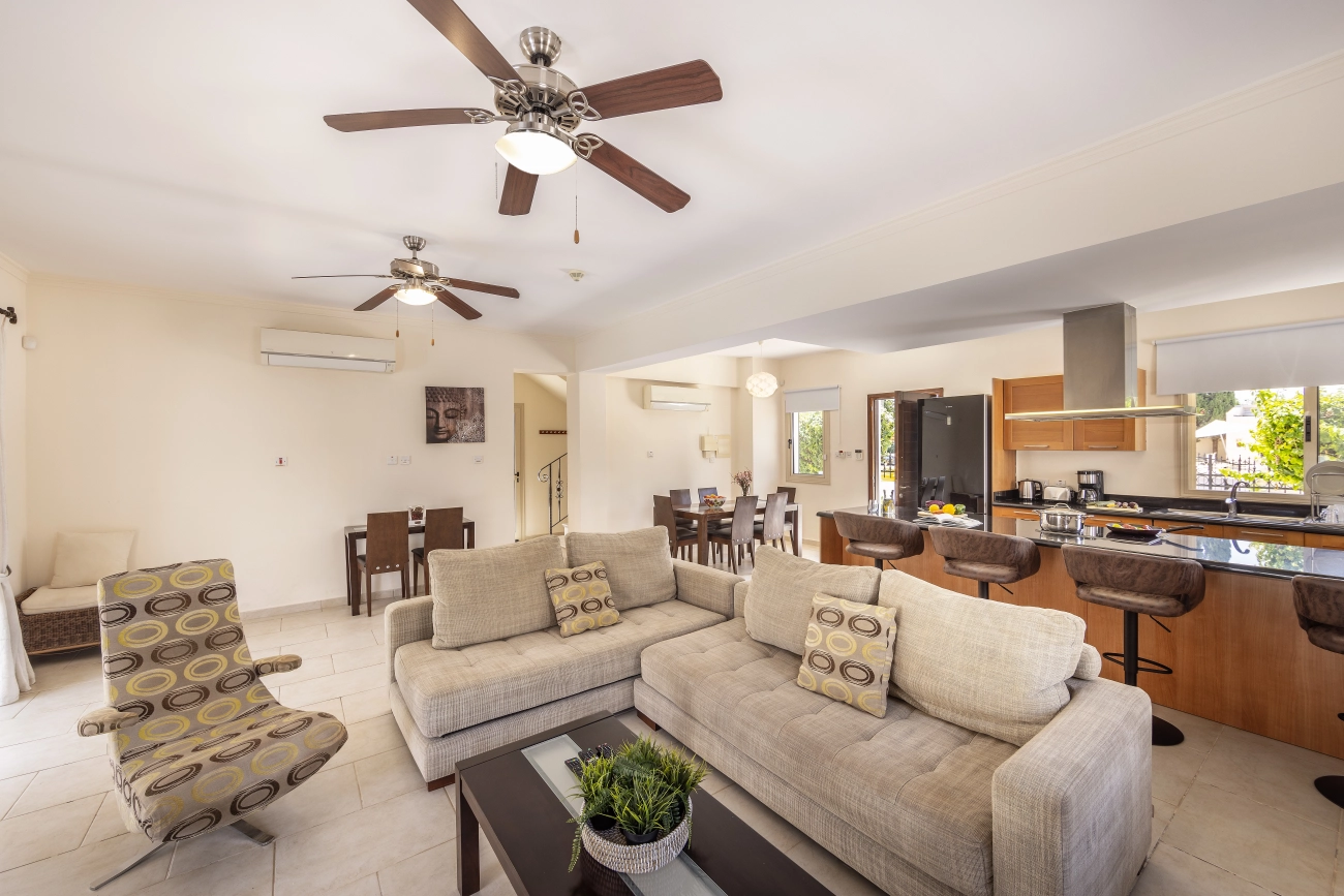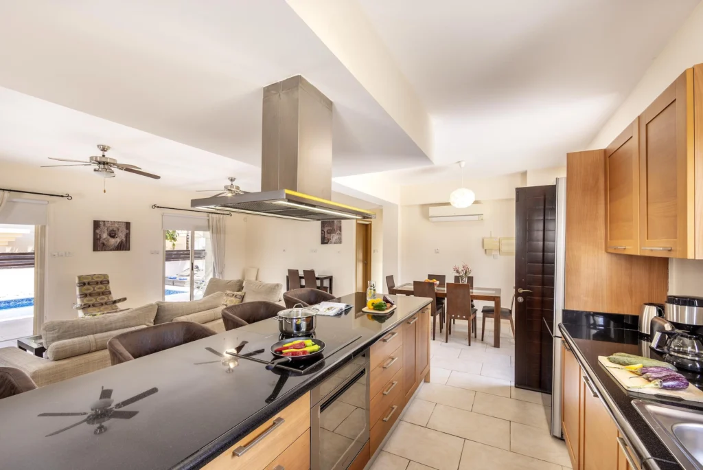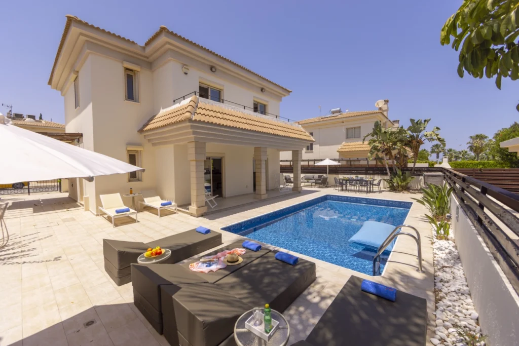 For sale a three-bedroom villa of 152 m2 on a plot of 360 m2 in the area of Kapparis, Famagusta. The villa includes 3 bedrooms, 2 bathrooms, 3 bathrooms, a kitchen, a living room, an open-plan dining area, a terrace, balconies and storage rooms. The residence is fully furnished with high-quality modern furniture and equipped with built-in kitchen appliances, including an oven, hob and extractor hood, as well as a fireplace, alarm system and electric shutters throughout the house. The property is located just 200 m from the sea and in close proximity to bars, restaurants, shops, supermarkets, bakeries and pharmacies. The property offers fenced parking, a spacious sun terrace with a large swimming pool, a well-maintained garden with mature tropical plants and trees, as well as magnificent sea views from all bedrooms, which makes this villa an ideal option for both comfortable living and investment in rent.