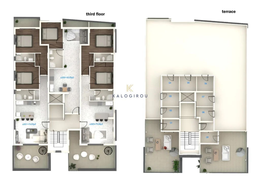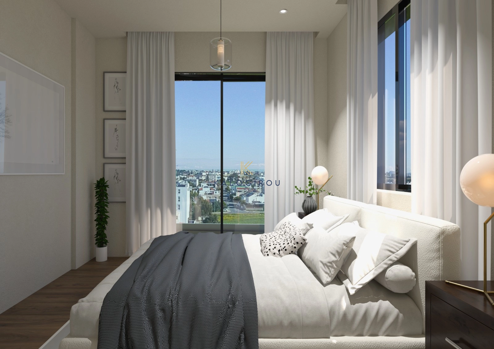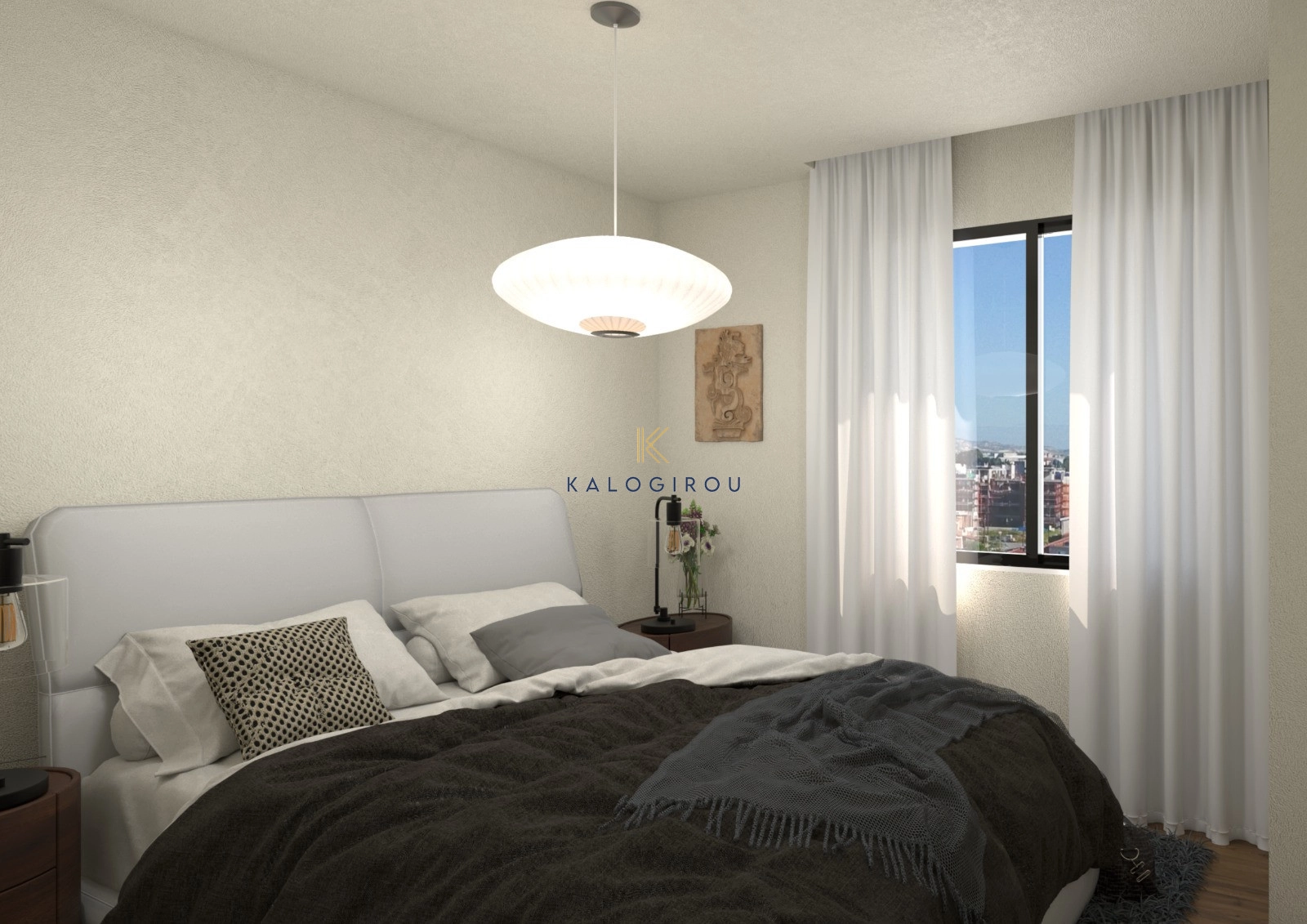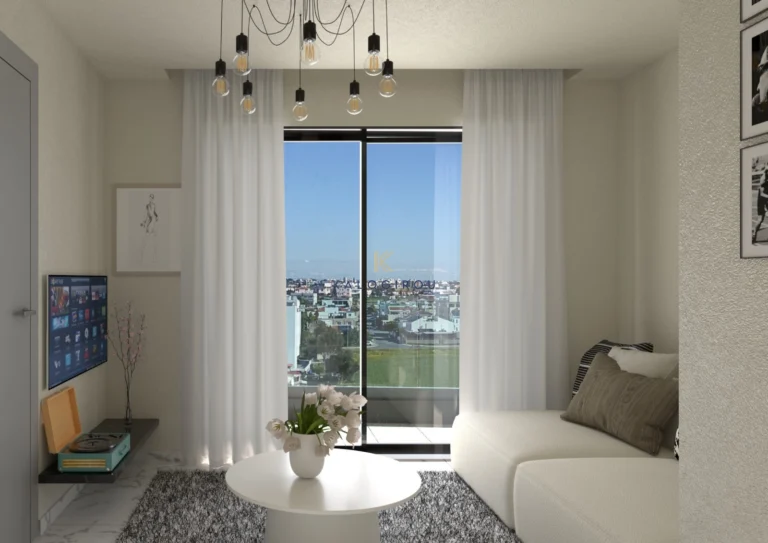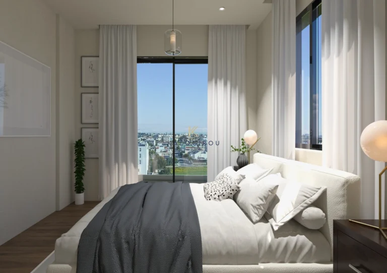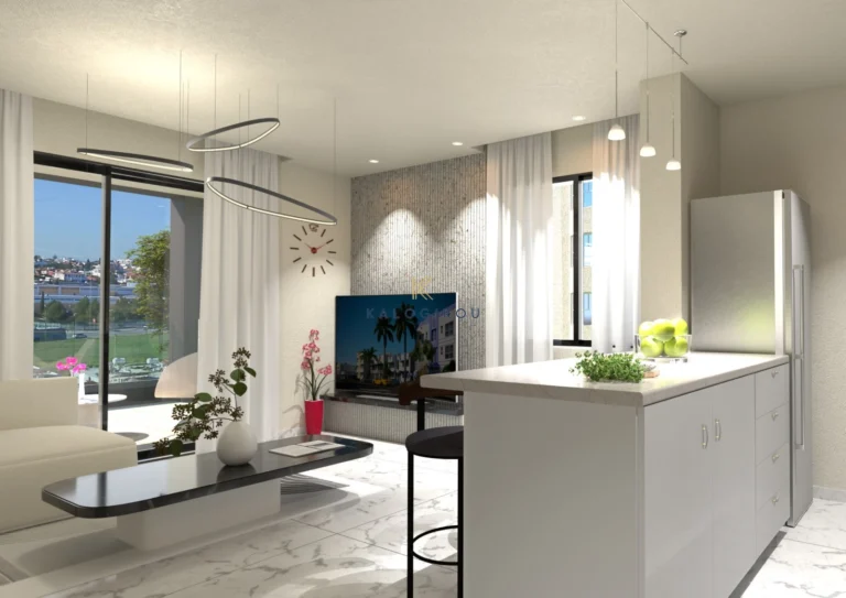 Modern, Top Floor Apartment for sale in Vergina area, Larnaca Town. The property consists of an open-plan kitchen and living room, two bedrooms, with the master bedroom featuring an en-suite bathroom, and one main bathroom. Additionally, the apartment includes a private parking space and a storage room on the ground floor of the building.