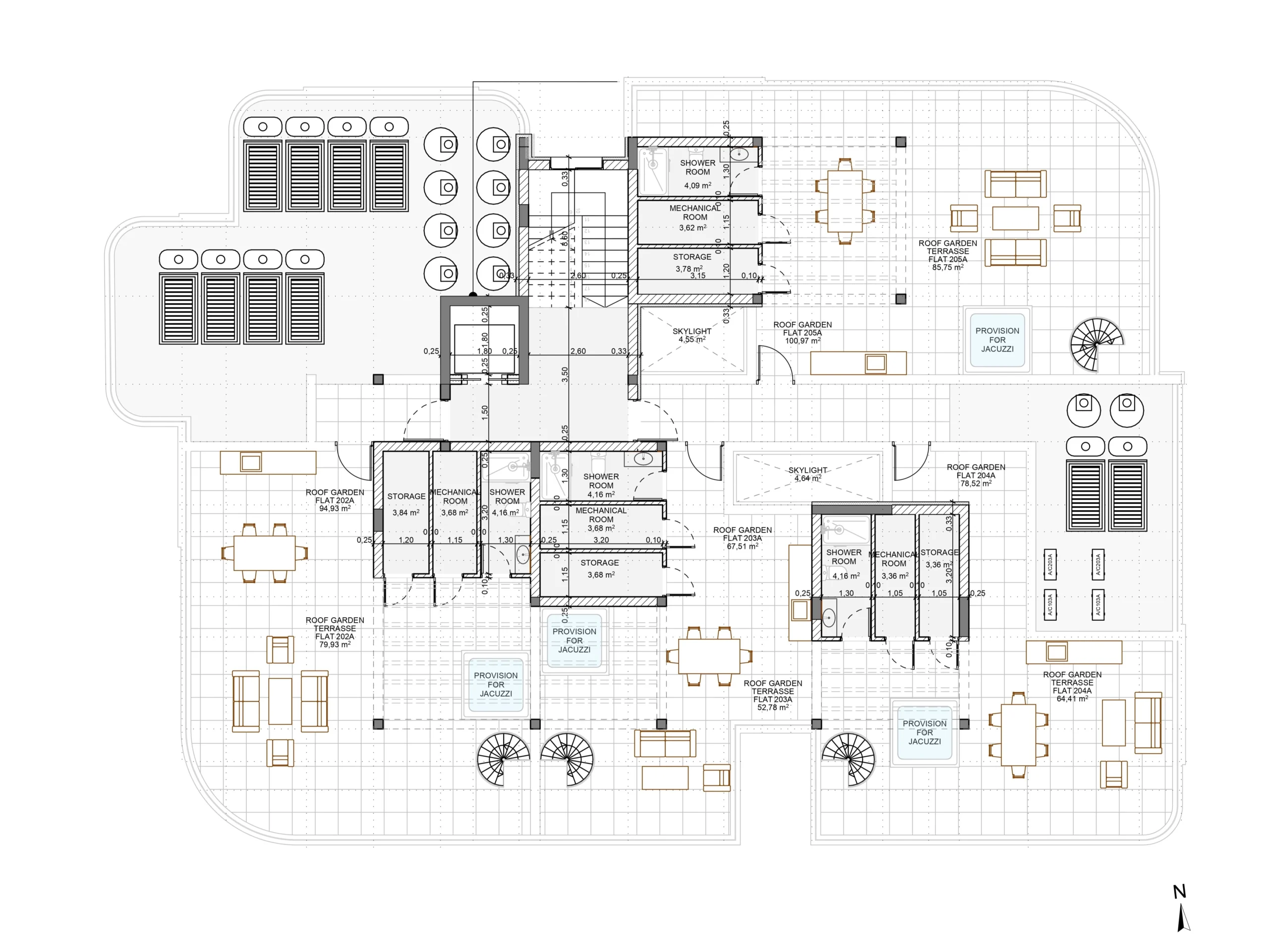 The penthouse offers a bright, well-planned layout with an open-plan living and dining area filled with natural light. The kitchen is modern and seamlessly integrated into the space, while both bedrooms are well-proportioned, providing comfort and privacy. Spacious terraces extend the living area outdoors, while the private rooftop offers an additional space ideal for relaxing, entertaining, or enjoying open views.