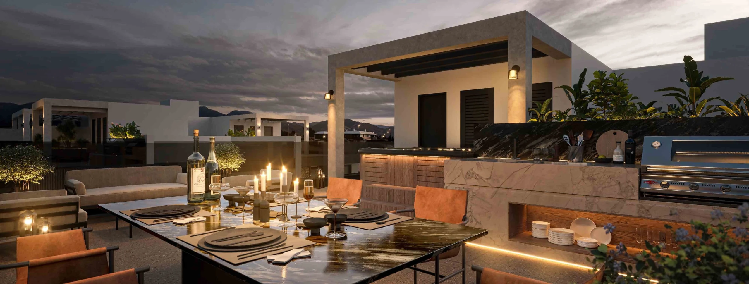 The penthouse offers a bright, well-planned layout with an open-plan living and dining area filled with natural light. The kitchen is modern and seamlessly integrated into the space, while both bedrooms are well-proportioned, providing comfort and privacy. Spacious terraces extend the living area outdoors, while the private rooftop offers an additional space ideal for relaxing, entertaining, or enjoying open views.
