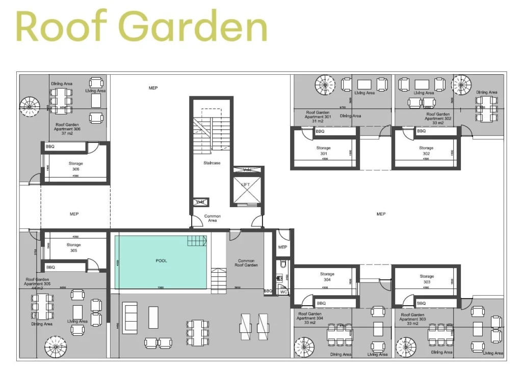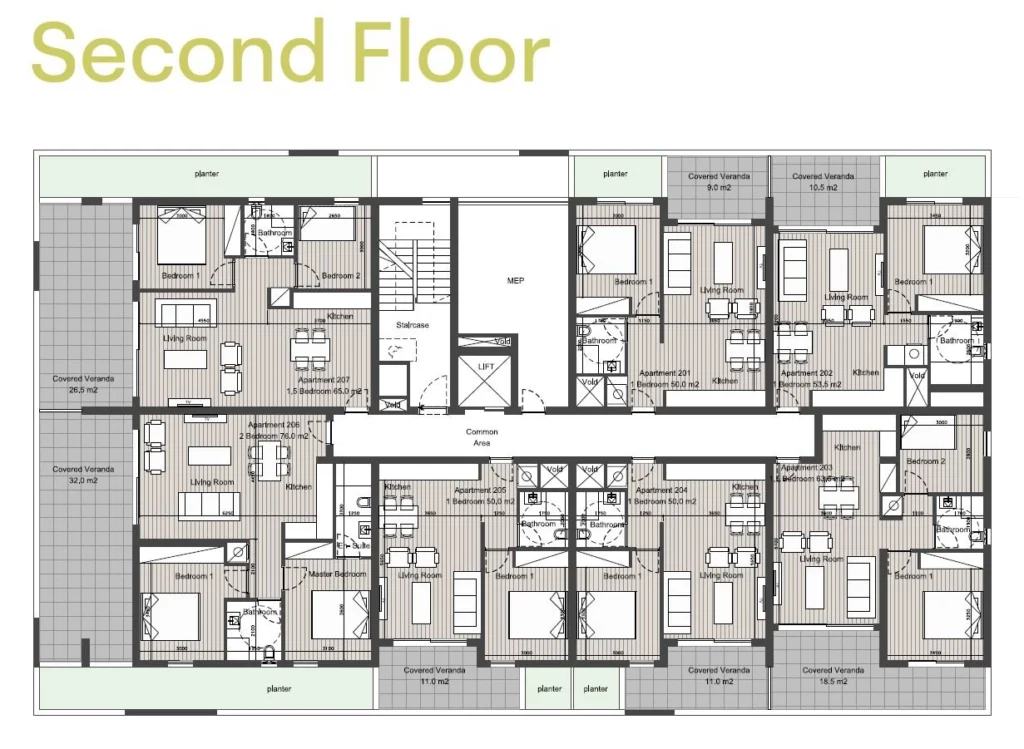 Characterised by clean architectural forms, balanced proportions, and carefully chosen materials, the development reflects a modern approach to residential living. Each apartment is designed to combine aesthetic clarity with practical layouts, creating comfortable homes suited to both private living and long-term investment. Each residence includes a private storage room and a covered parking space, adding practicality and convenience to everyday living.