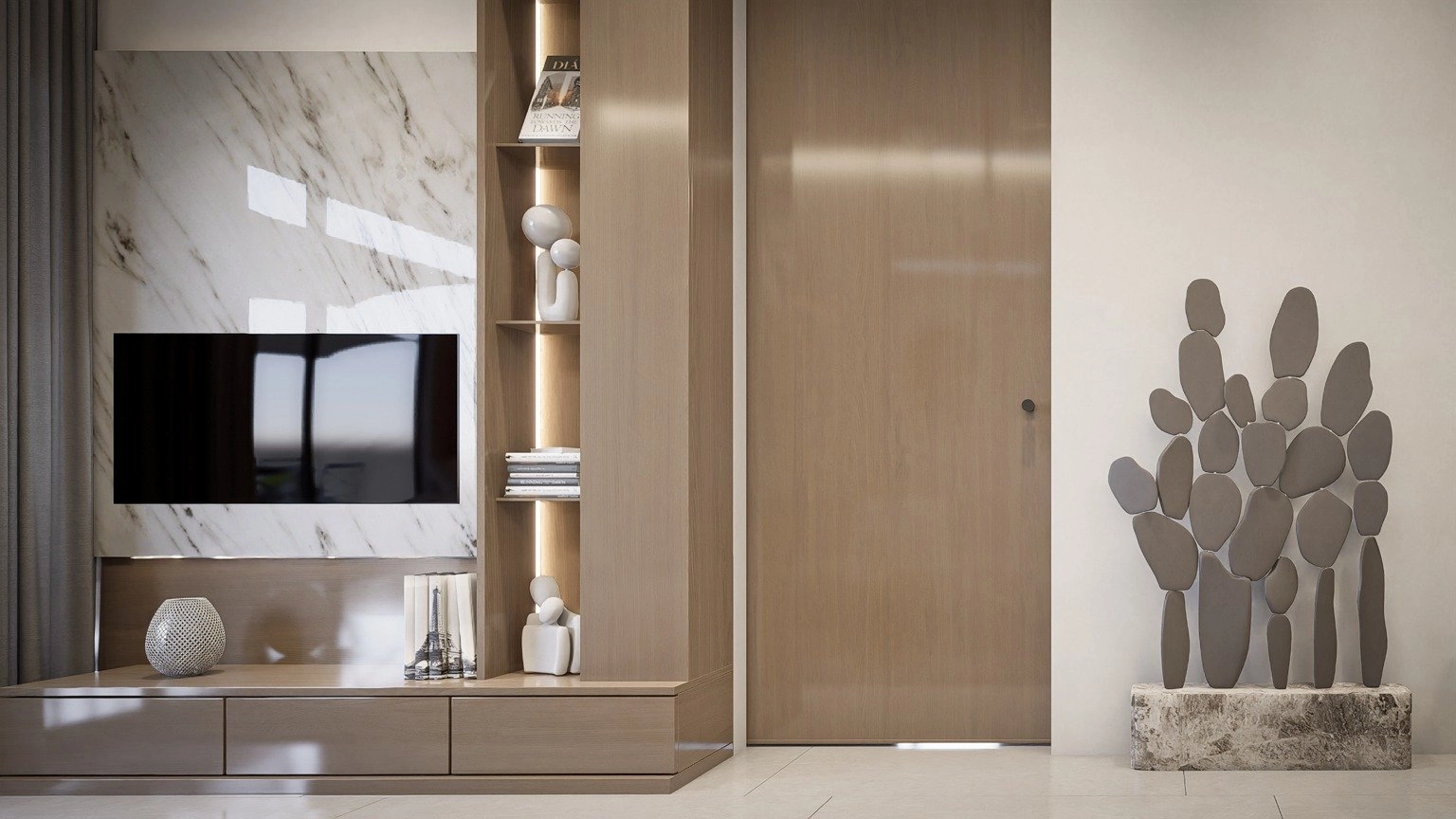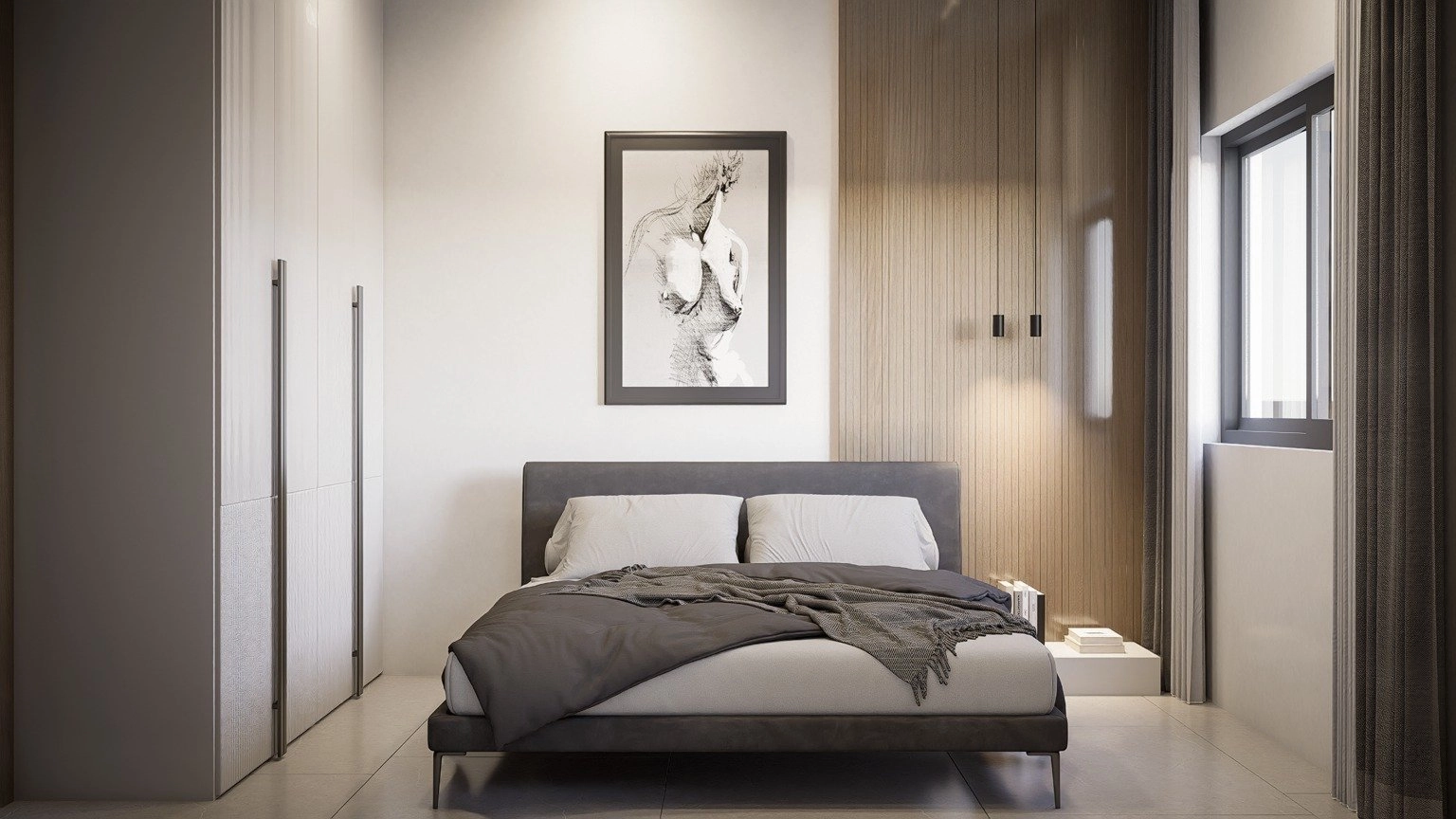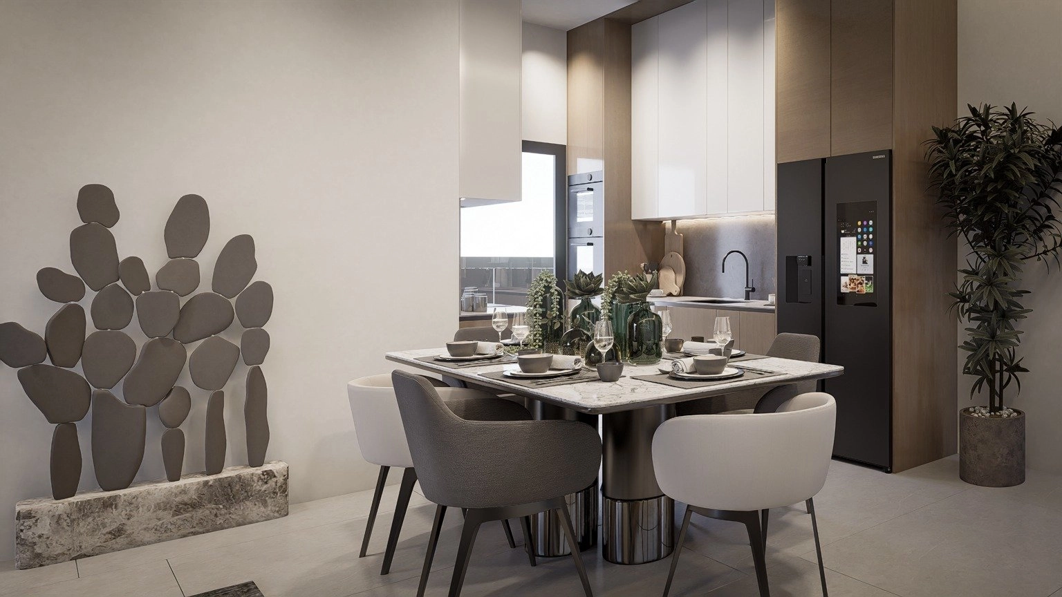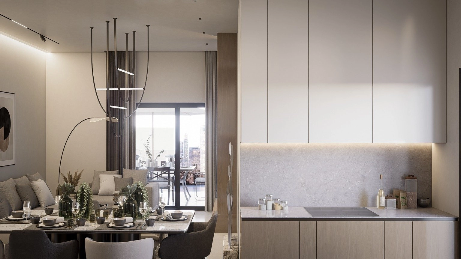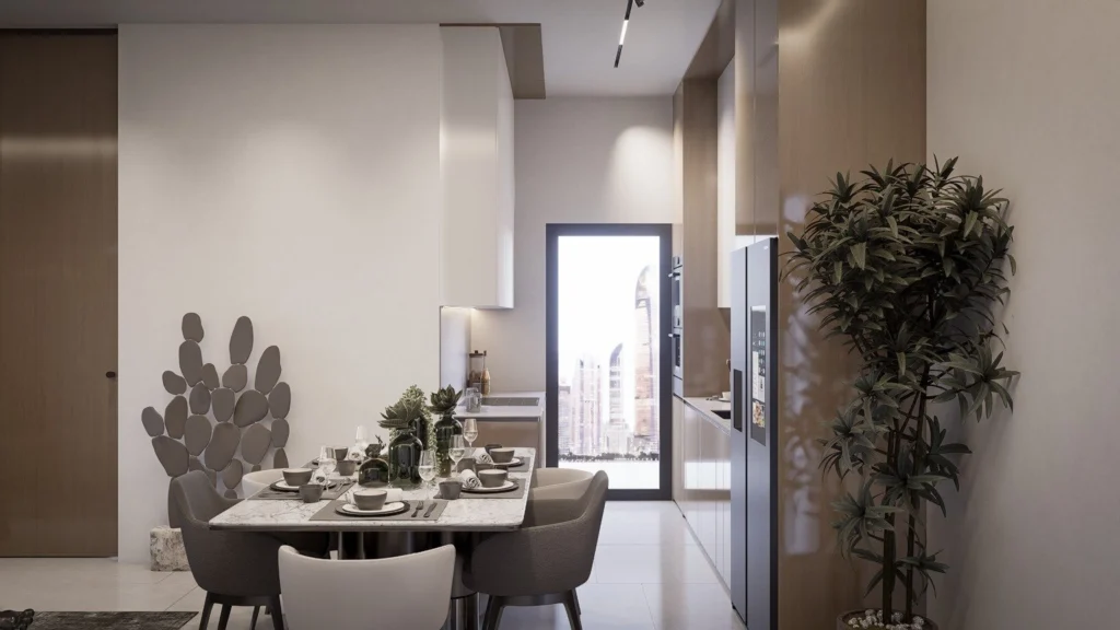 The apartment offers a bright open-plan living area with large windows for natural light. The kitchen is modern and integrated, while both bedrooms are well-proportioned and comfortable. Minimalist design and quality finishes create a clean, elegant feel.