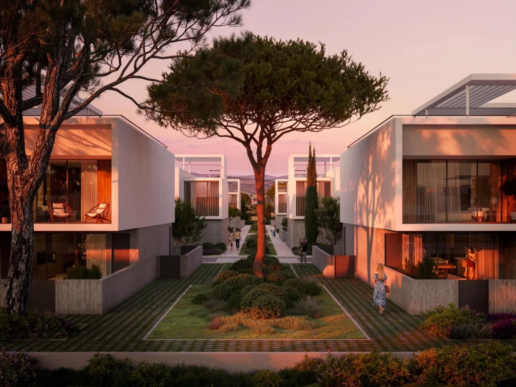The development features spacious 2 and 3-bedroom apartments alongside an exclusive collection of 3 and 4-bedroom villas, each with its own private swimming pool. The architectural vision emphasizes both elegance and functionality, featuring generous 3.10m ceiling heights in living areas, parquet flooring throughout, marble-finished bathrooms, and underfloor central heating.