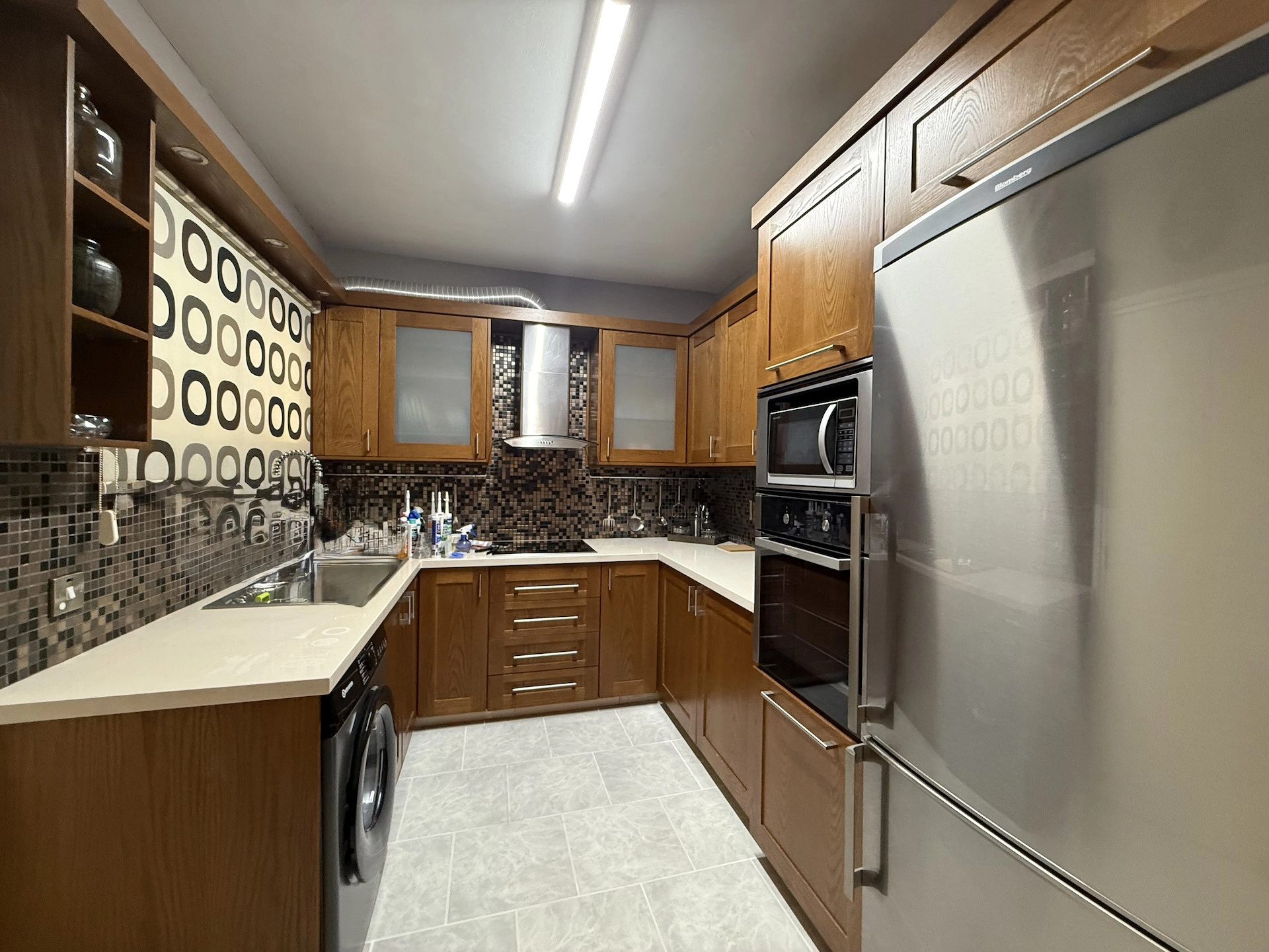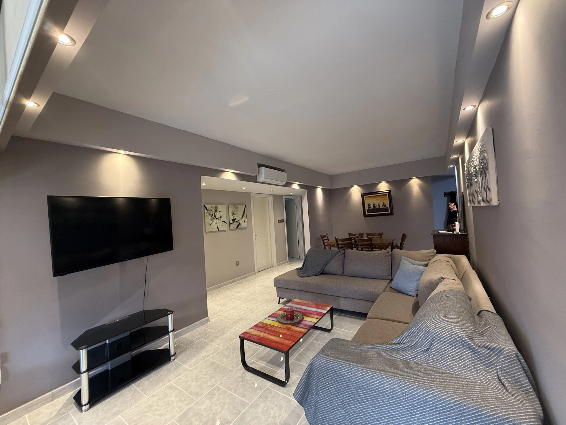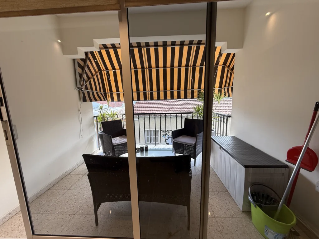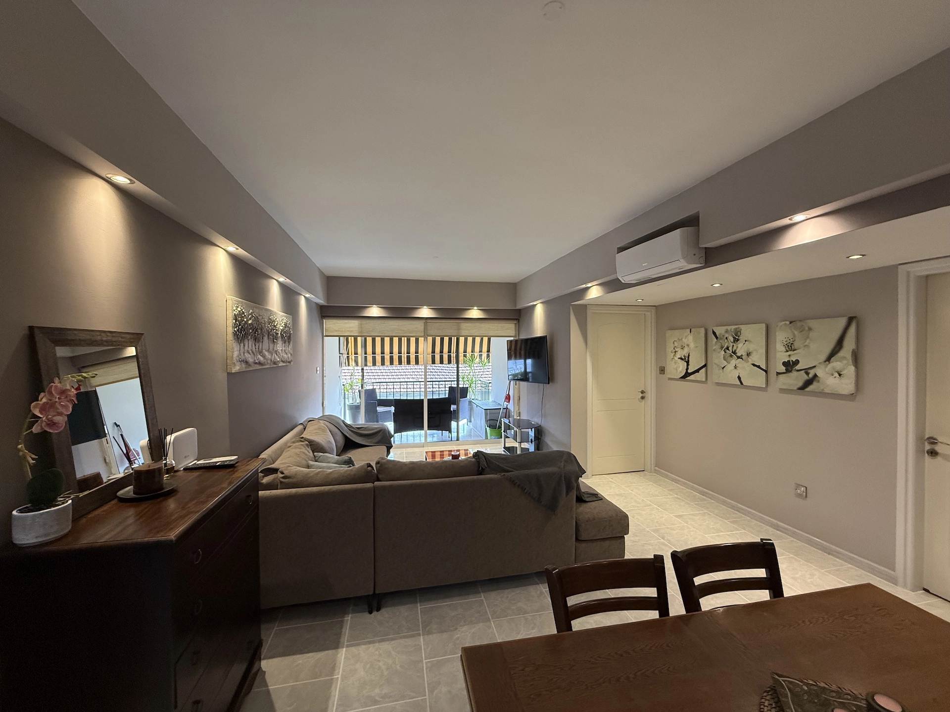 The apartment features a partially separate, fully equipped kitchen, including a dishwasher, a new washing machine, and complete cookware and cutlery. The bright and inviting living/lounge/TV area provides a relaxing space, with patio doors opening onto a private balcony fitted with a new electric awning.