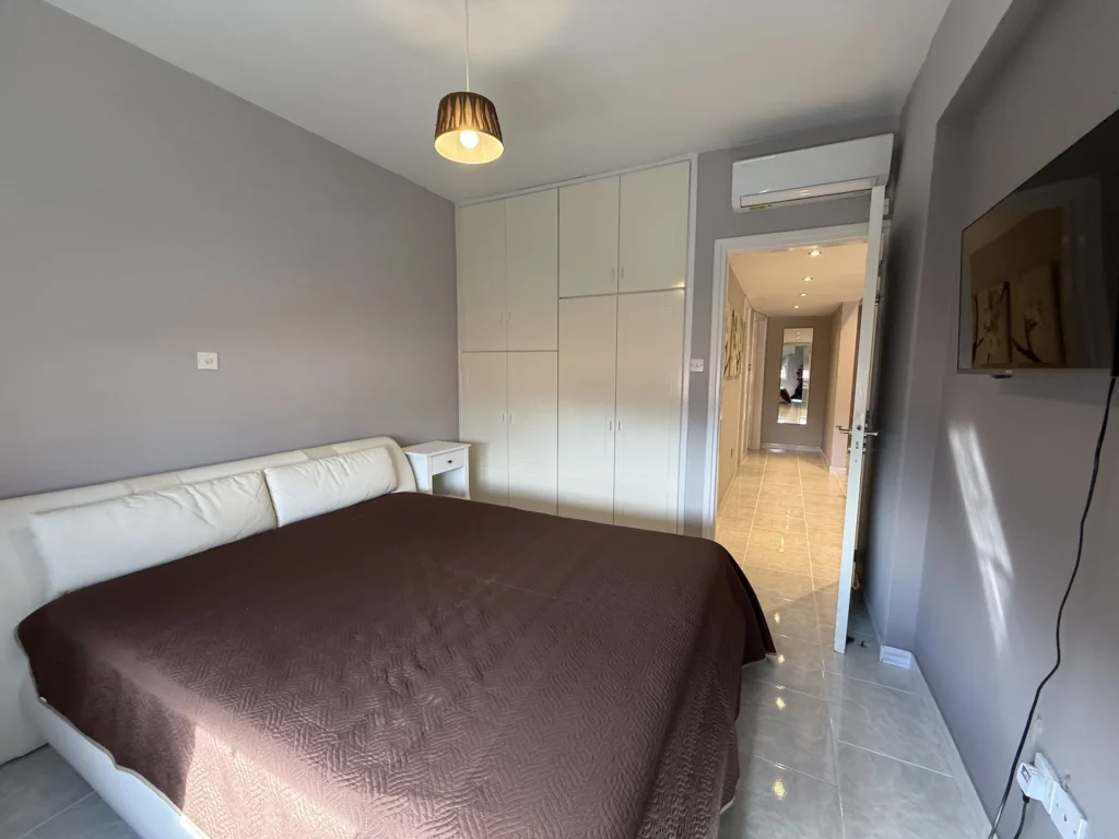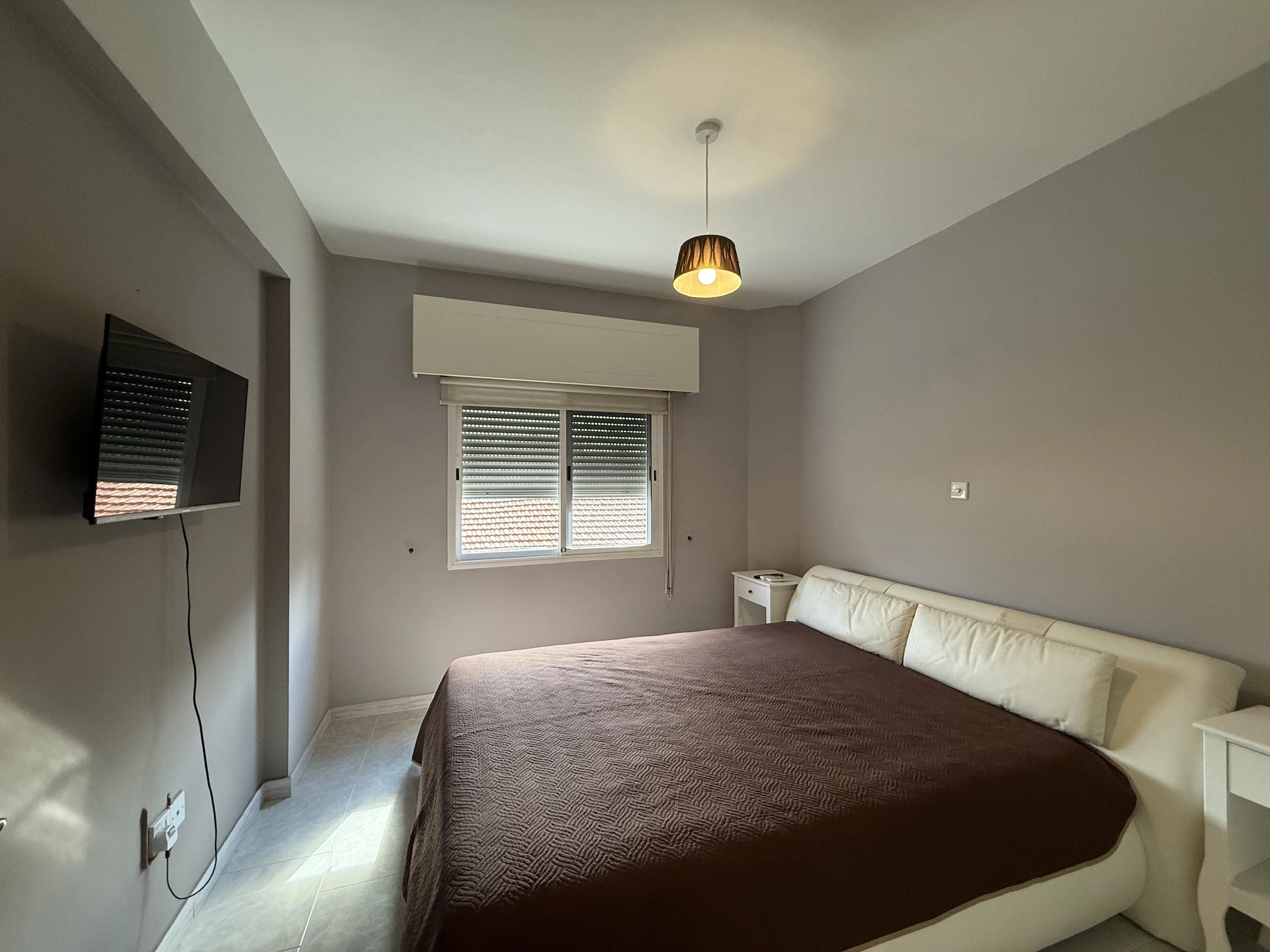 There are two well-proportioned bedrooms, both with fitted wardrobes, shutters, and fly screens, along with a modern main bathroom.
