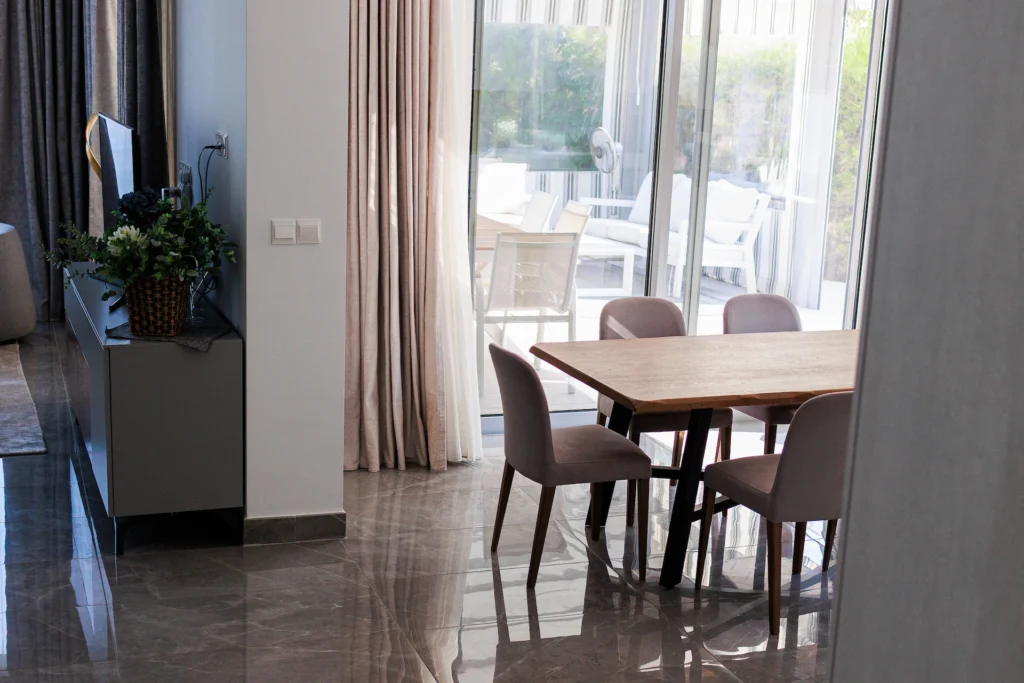 A bright and airy open-plan living and dining area with panoramic sea views, seamlessly connected to the kitchen and designed for effortless everyday living and entertaining.
