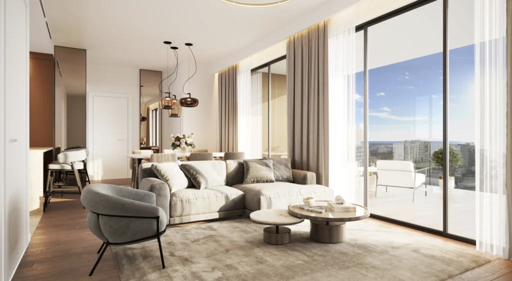 Large sliding doors lead to a private balcony, allowing natural light to fill the apartment while extending the living area outdoors.