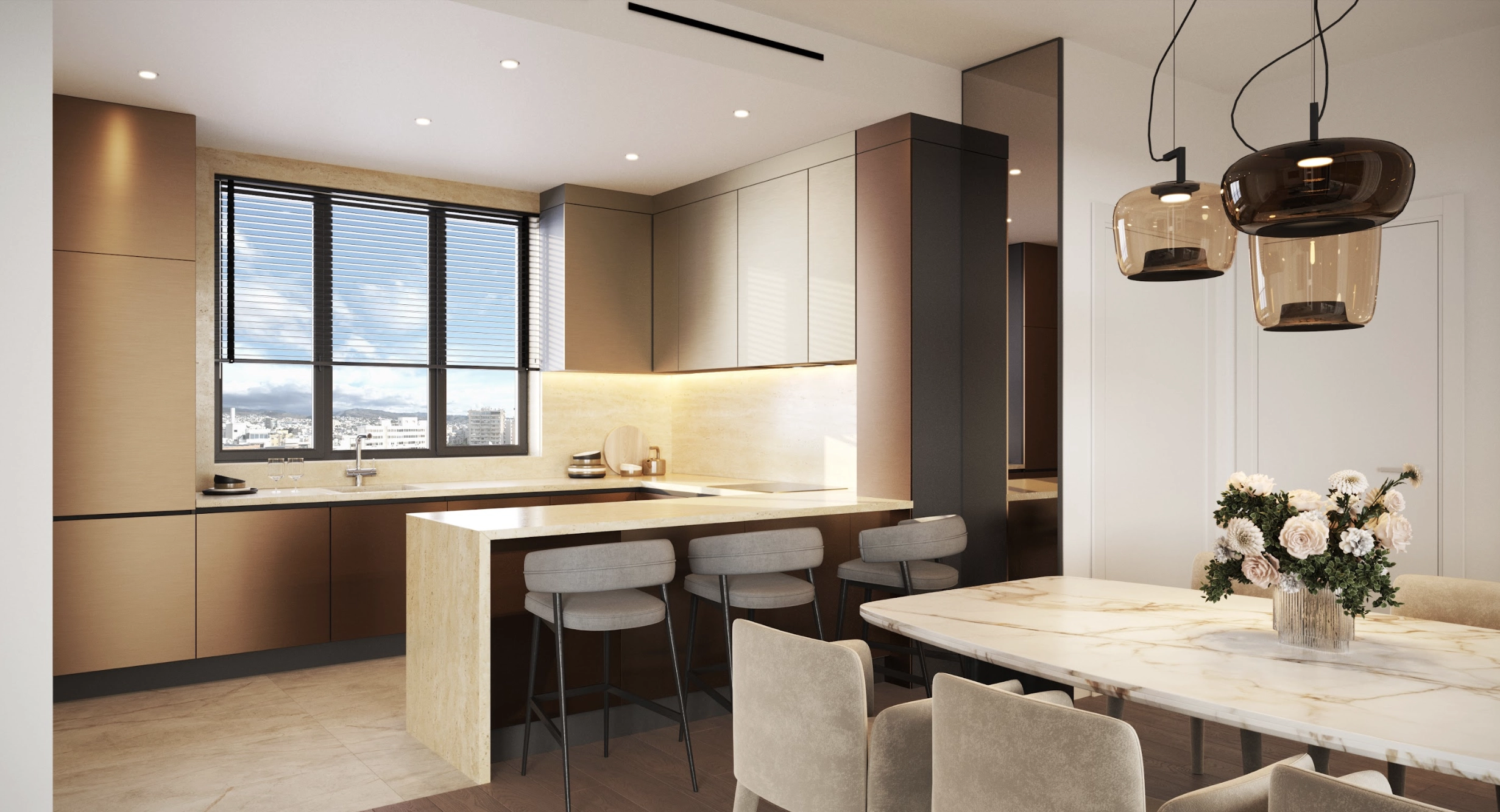Large sliding doors lead to a private balcony, allowing natural light to fill the apartment while extending the living area outdoors.