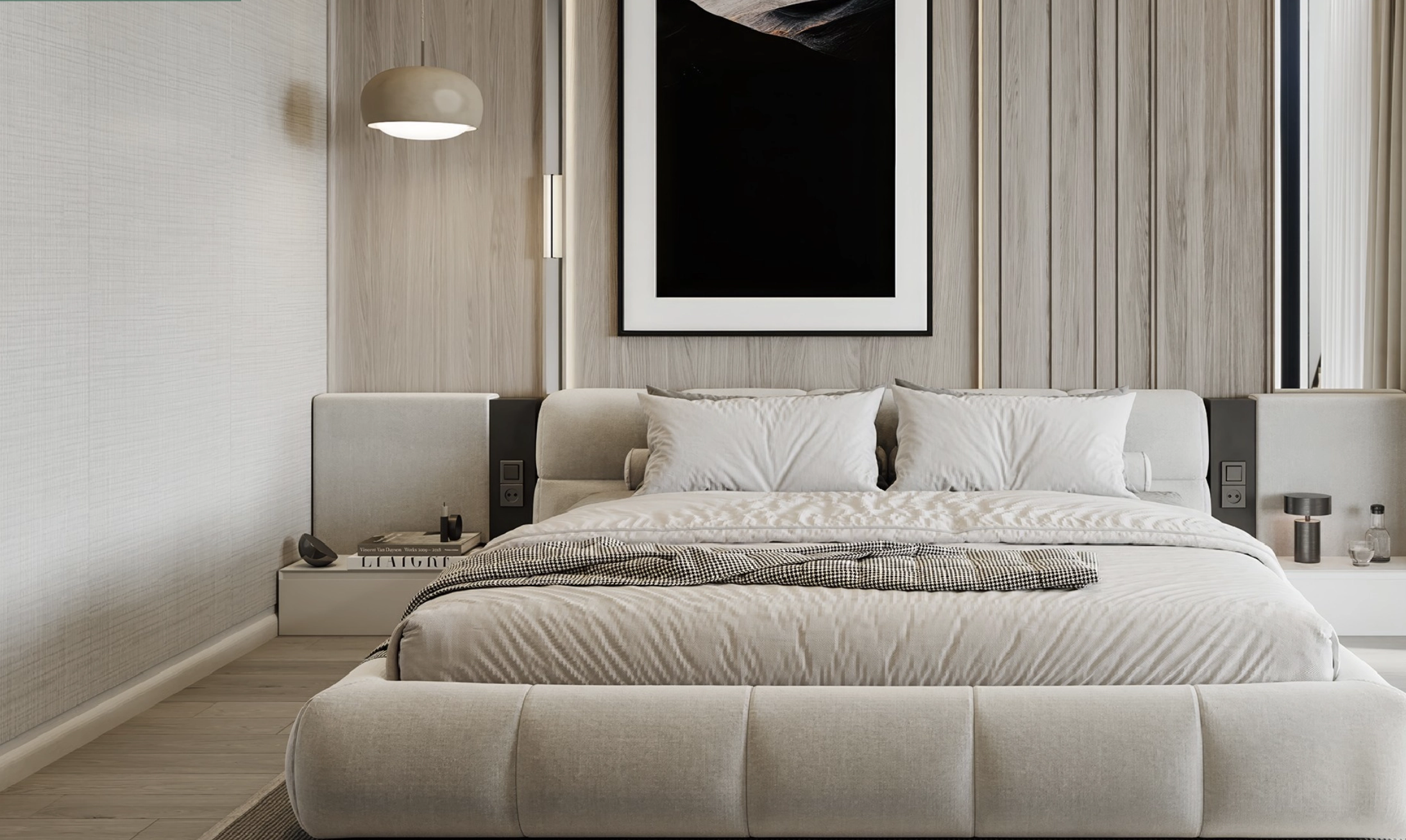 Large windows enhance both natural light and ventilation, creating a fresh and airy environment throughout the day. The design focuses on simplicity and elegance, using high-quality materials and neutral tones to create a relaxing and timeless feel.